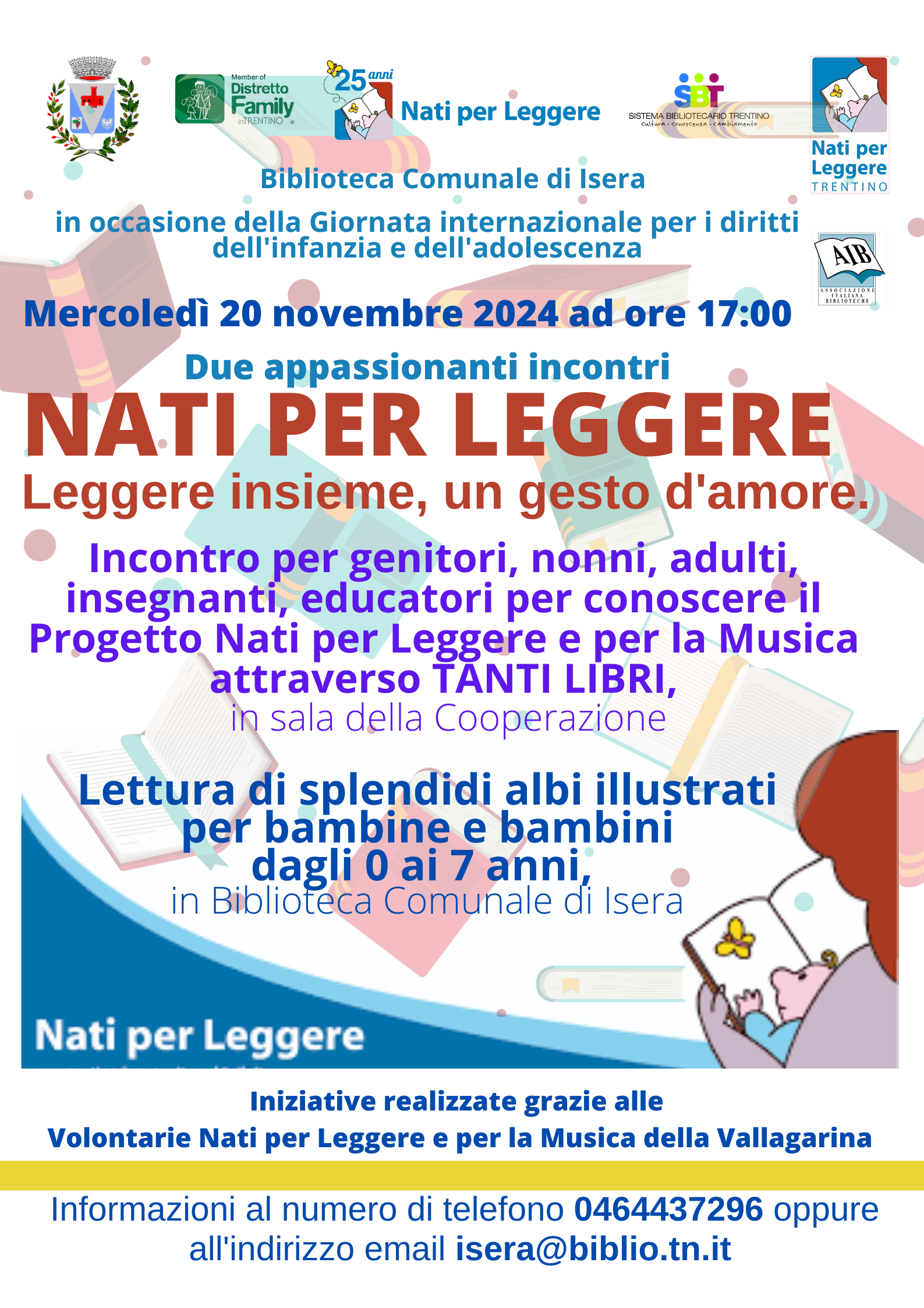 In occasione della Giornata internazionale per i diritti dell'infanzia e dell'adolescenza, Mercoledì 20 novembre ad ore 17:00si terranno due appassionanti incontriNati per leggere: Leggere insieme, un gesto d'amore.- in Sala della CooperazioneIncontro per genitori, nonni, adulti, insegnanti, educatori...per conoscere il Progetto Nati per Leggere e per la Musica attraverso la conoscenza di tanti libri.- in Biblioteca Comunale di IseraLettura di splendidi albi illustrati per bambine e bambini dagli 0 ai 7 anni.Incontri realizzabili grazie ad alcune Volontarie NPLM della Vallagarina.Informazioni al numero 0464 437296 o tramite mail all'indirizzo isera@biblio.tn.it