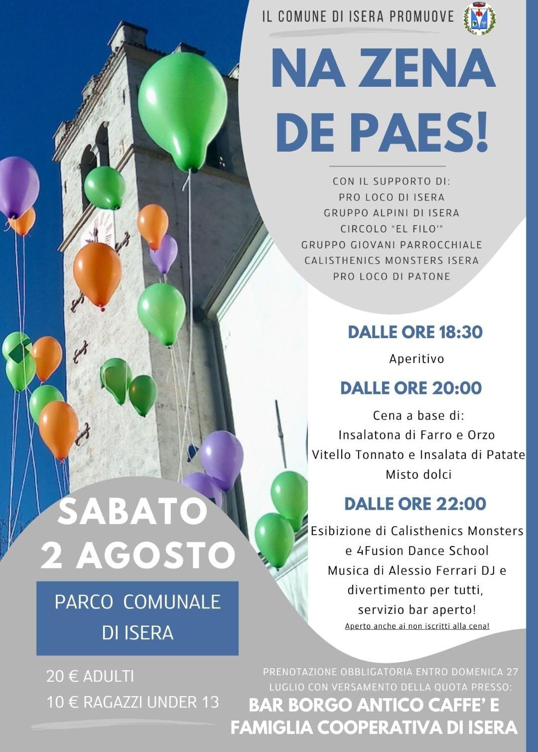 Na zena de paes ... sotto il cielo estivo, le lunghe tavolate si riempiono di sorrisi e profumi di piatti genuini. Il vino scorre tra un brindisi e l’altro, i bambini corrono tra le sedie, le storie degli anziani si mescolano alle risate dei più giovani. È una serata senza fretta, dove il gusto della tradizione incontra la gioia di stare insieme. Una festa semplice, fatta di cibo, musica e soprattutto di persone: la comunità che si ritrova, si riconosce e si rinnova.